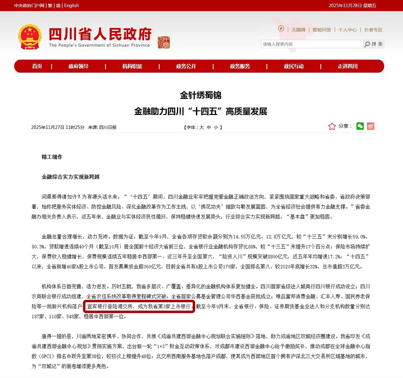 四川省人民政府官方网站11月27日发文《金针绣蜀锦金融助力四川“十四五”高质量发展》,介绍了我省金融业“十四五”期间发展成就,文中特别提到“宜宾银行登陆港交所,成为我省第3家上市银行”,肯定我行上市作为四川金融业“十四五”期间的重大成就之一。
